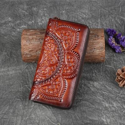 رجعية محفظة محفظة حقيبة طويلة الطبيعة بقرة الجلد المصنوعة يدويا محفظة الأزهار المنقوش